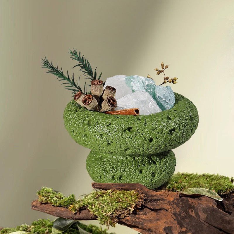 Each diffuser is sculpted from delicately textured stone in shades of moss green, blush pink, cloud white, and midnight black, holding a cluster of natural crystals that shimmer like fragments of untouched earth.